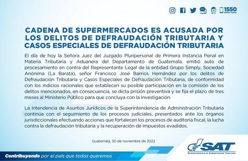 El Juzgado Pluripersonal de Primera Instancia Penal en Materia Tributaria y Aduanera del Departamento de Guatemala emitió el auto de procesamiento en contra de Barrios quien es el representante legal del Grupo Simply, Sociedad Anónima, cuyo nombre comercial es La Barata.
