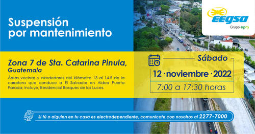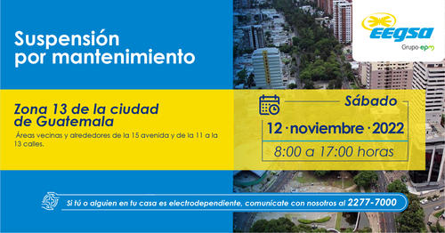 La Empresa Eléctrica de Guatemala (Eegsa) suspenderá este sábado 12 de noviembre el servicio de energía eléctrica en algunos sectores.