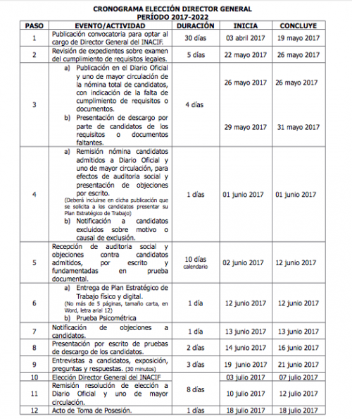 La revisión de expedientes empezará el próximo 22 de mayo, en el que se evaluará el cumplimiento de los requisitos legales por parte del Consejo Directivo del Inacif.