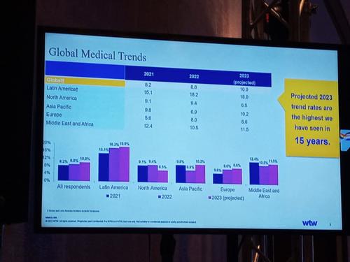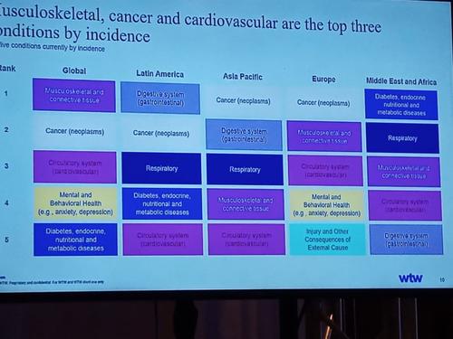 Julián Hernández, de la consultora Willis Towers Watson, presentó las tendencias médicas globales. A nivel mundial, el cáncer es una de las enfermedades más frecuentes y es una de las que requiere mayor inversión, por lo que su cobertura se vuelve más costosa, esto no solo se ve en Guatemala, sino que el mundo. Le siguen problemas gastrointestinales, cardiovasculares y diabetes.
