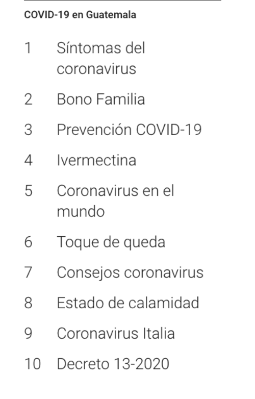 De los temas relacionados con el Covid-19 en Guatemala, el top cinco está conformado por: Síntomas del coronavirus, Bono Familia, Prevención Covid-19, Ivermectina y Coronavirus en el mundo.