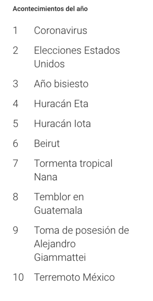 En el apartado de Acontecimientos, los cinco más importantes fueron Coronavirus, Elecciones Estados Unidos, Año bisiesto, Huracán Eta y Huracán Iota.