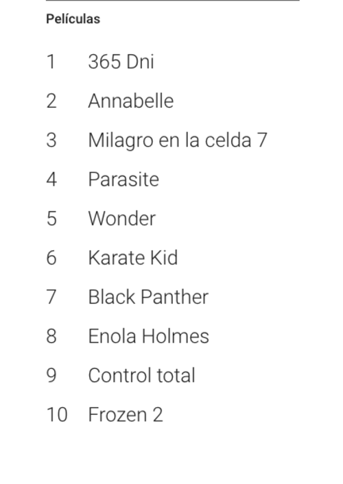 Las películas más buscadas fueron “365 Dni”, “Anabelle”, “Milagro en la celda 7”, “Parasite” y “Wonder”.