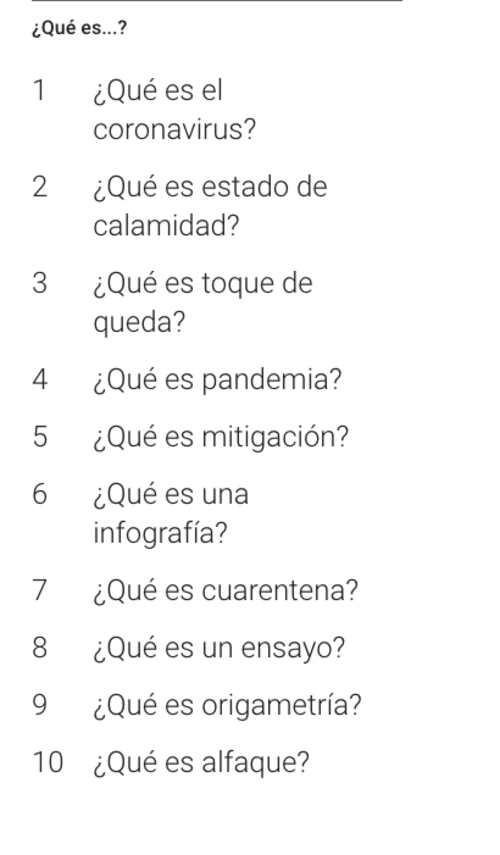 Las cinco preguntas más populares que empiezan con la frase ¿Qué es…? Son: ¿Qué es el coronavirus?, ¿Qué es estado de calamidad?, ¿Qué es toque de queda?, ¿Qué es pandemia? y ¿Qué es mitigación?