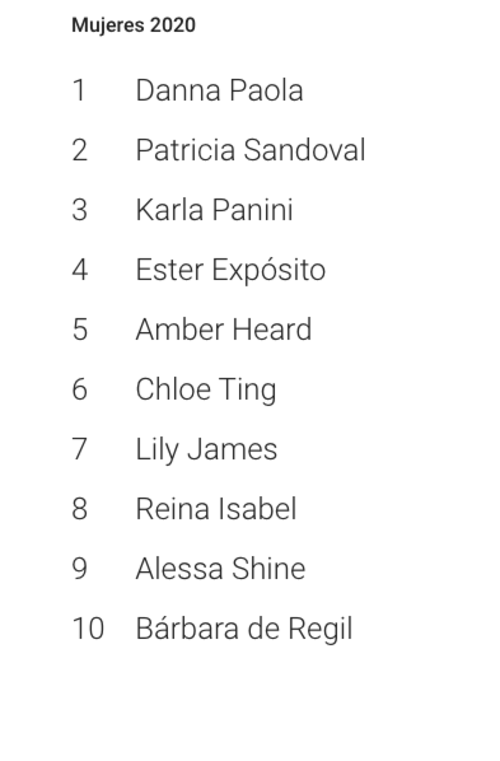 Las mujeres más populares entre los guatemaltecos fueron Danna Paola, Patricia Sandoval, Karla Panini, Ester Expósito y Amber Heard.