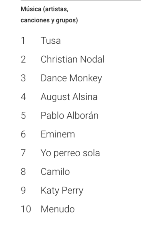En Música, que incluye artistas, canciones y grupos, lo encabeza “Tusa” de Karol G y Nicki Minaj; Christian Nodal, “Dance Monkey, August Alsina y Pablo Alborán.
