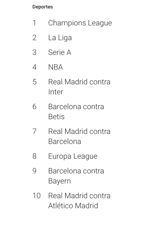 En Deportes, lo más consultado en Google fue Champions League, La Liga, Serie A, NBA y Real Madrid contra Inter.