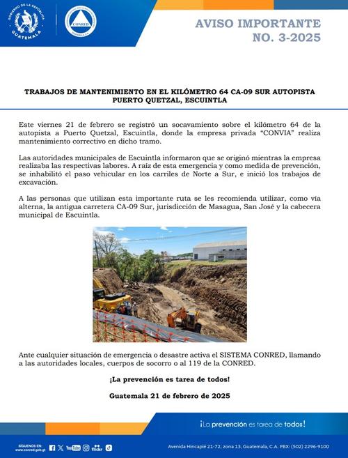 Mientras las labores se llevan a cabo, la Coordinadora Nacional para la Reducción de Desastres (Conred) recomendó usar como vía alterna la antigua carretera CA-9 Sur, que conecta Masagua, San José y la cabecera municipal de Escuintla.