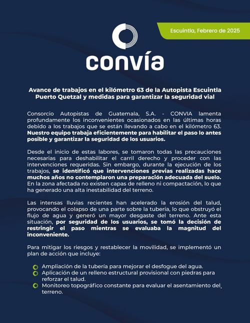 Por medio de un comunicado, el Consorcio de Autopistas de Guatemala, S. A. (Convía) dio a conocer que se prevé habilitar el paso por uno de los carriles restringidos en lapso de unas horas, pero la reparación del tramo completo tardaría más.
