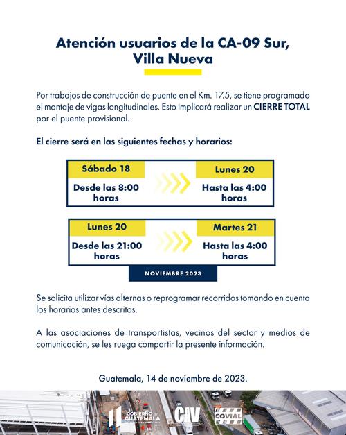 Este sábado 18 de noviembre se inició con el montaje de vigas longitudinales para el puente permanente que se construye en el kilómetro 17.5 de la ruta al Pacífico, en jurisdicción de Villa Nueva.