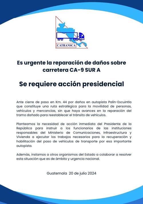 Aparte del Comité Coordinador de Asociaciones Agrícolas, Comerciales, Industriales y Financieras (CACIF), la Cámara de Transportistas Centroamericanos (Catransca) se ha pronunciado al respecto.