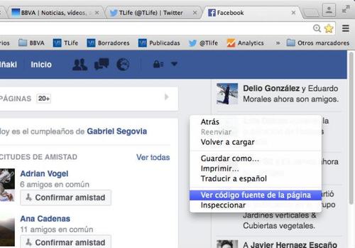 1. Debes tener abierta tu cuenta de Facebook en Google Chrome. Debes dar un click en un lugar donde no existan enlaces que te llevan a otra pagina. Luego pulsas el botón derecho del ratón y en el menú que aparece selecciona “Ver código fuente”.