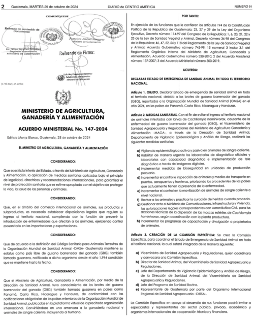 El ministro recordó que este miércoles 30 de octubre se publicó en el Diario de Centro América el Acuerdo Ministerial 147-2024, que declara el estado de emergencia de Sanidad Animal en todo el territorio por un plazo de dos años.