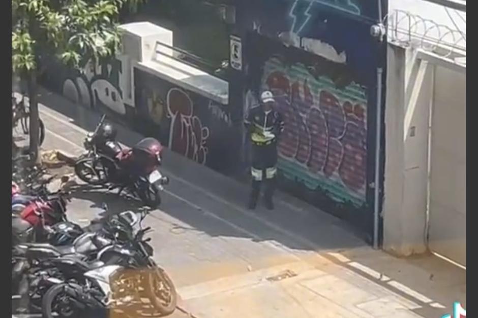 En video quedó grabado el momento en que un agente de la Policía Municipal de Tránsito (PMT) encuentra una motocicleta estacionada justo en una acera de zona 4.
