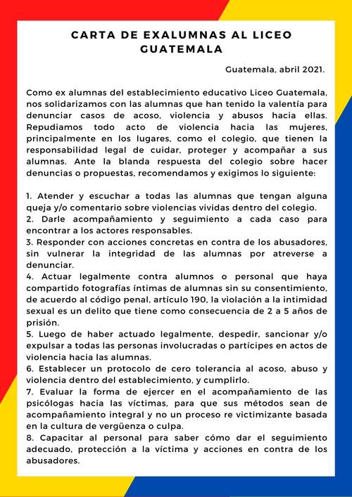 Un grupo de exalumnas del Liceo Guatemala escribió una carta abierta a la administración del colegio, para mostrar solidaridad con las estudiantes que denunciaron acoso sexual y exigir proteger y acompañar a las afectadas.