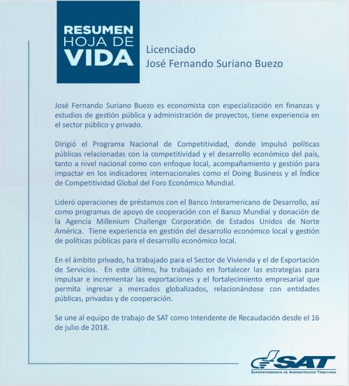 José Fernando Suriano Buezo fue juramentado este lunes como nuevo Intendente de Recaudación de la Superintendencia de Administración Tributaria (SAT).