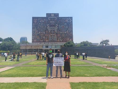 Por su parte, estos egresados, desde México se han tomado una fotografía frente a uno de los edificios de la UNAM de fondo y con un cartel que dice: "Desde MX los egresados Usac desconocemos a Walter Mazariegos".