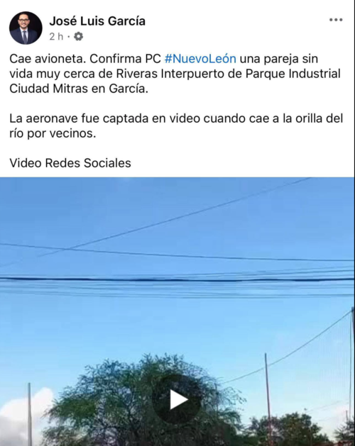 "Cae avioneta. Confirma PC Nuevo León una pareja sin vida muy cerca de Riveras Interpuerto de Parque Industrial Ciudad Mitras en García. La aeronave fue captada en video cuando cae a la orilla del río por vecinos".