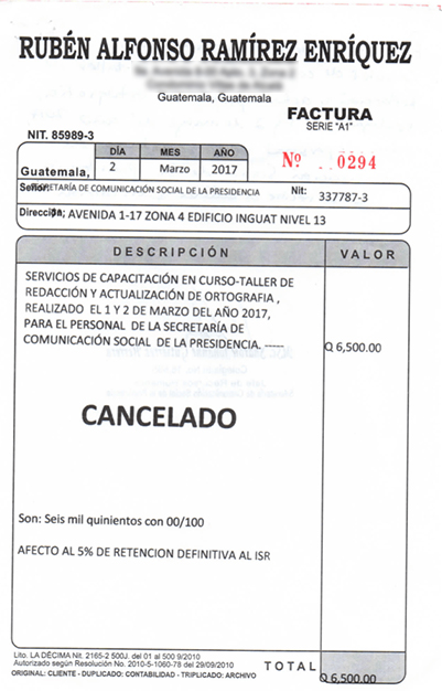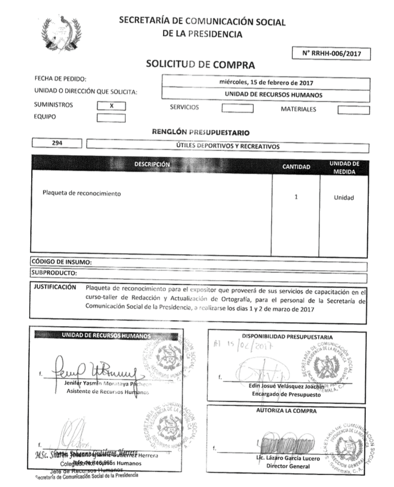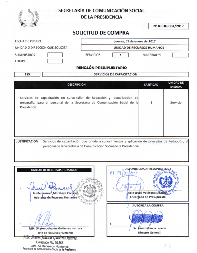 El Taller de Redacción y Actualización de Ortografía, que se efectuó el 1 y 2 de marzo, le costó al Estado 6 mil 500 quetzales. La contratación se efectuó por la modalidad de compra directa, por lo que no se recibieron más ofertas.