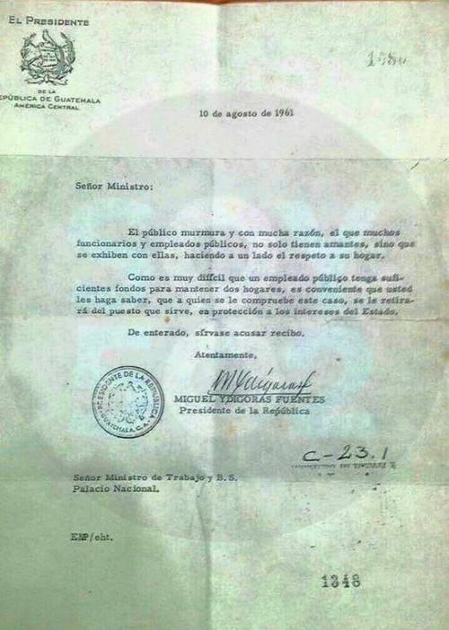 Atendiendo a murmuraciones, el expresidente Ydígoras Fuentes amenazó a los funcionarios y empleados públicos que tuvieran amantes y que "se exhibieran" con ellas.