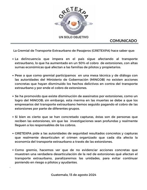 La Gremial de Transporte Extraurbano de Pasajeros (Gretexpa) dio a conocer que en lo que va del año fallecieron 97 pilotos por no ceder a la extorsión y aseguraron que, de no combatir esta situación, procederán a la paralización del servicio.