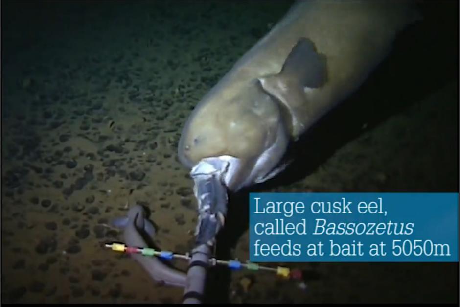 El video difundido por la británica Universidad de Aberdeen muestra que los peces más grandes habitan a menor profundidad (de 5 mil a 6 mil 500 metros), como por ejemplo las "colas de ratas", los congribadejos y las anguilas.