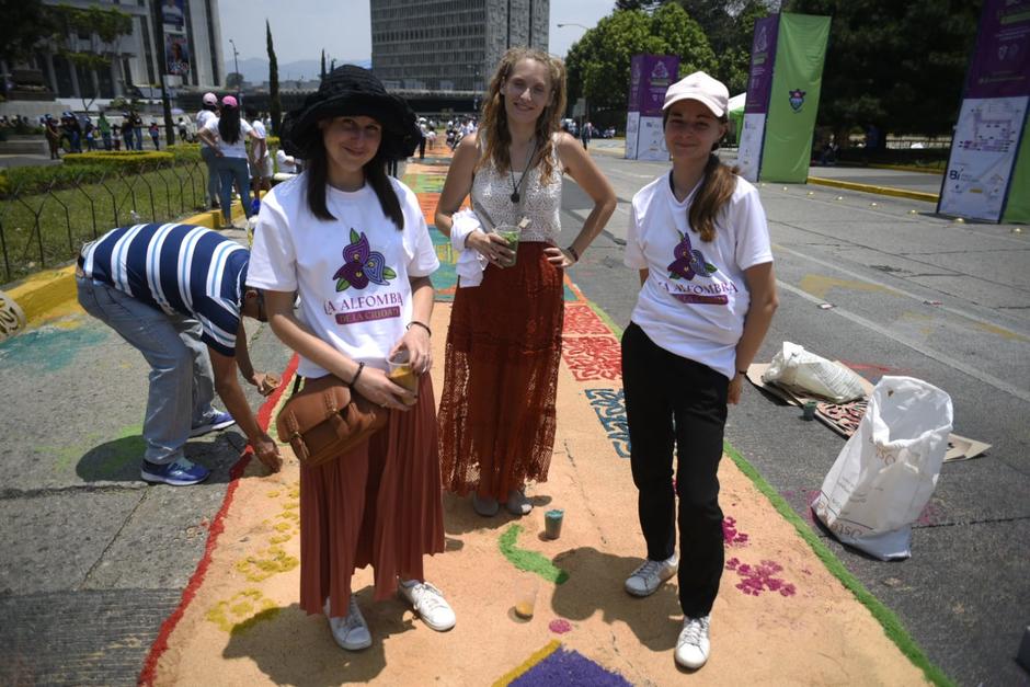 Tres jóvenes extranjeras decidieron ser parte de la elaboración de la alfombra más grande de Guatemala.