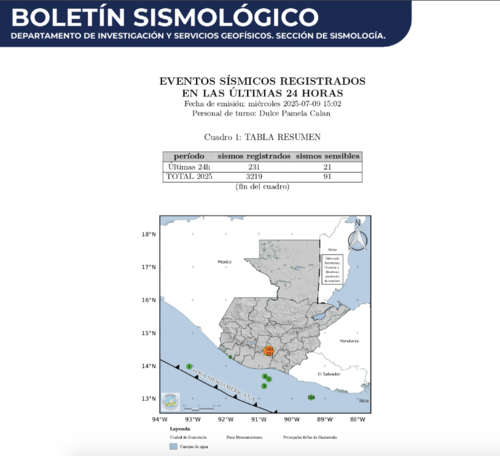 En las últimas 24 horas se han registrado 231 sismos, de los cuales 21 han sido sensibles en parte de territorio nacional, según el Instituto Nacional de Sismología, Vulcanología, Meteorología e Hidrología (Insivumeh).