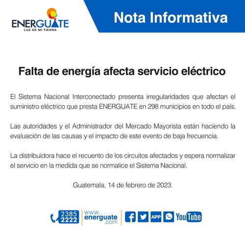 Mientras que Energuate, confirmó que el suministro eléctrico que presta en 298 municipios en todo el país se vio afectado.