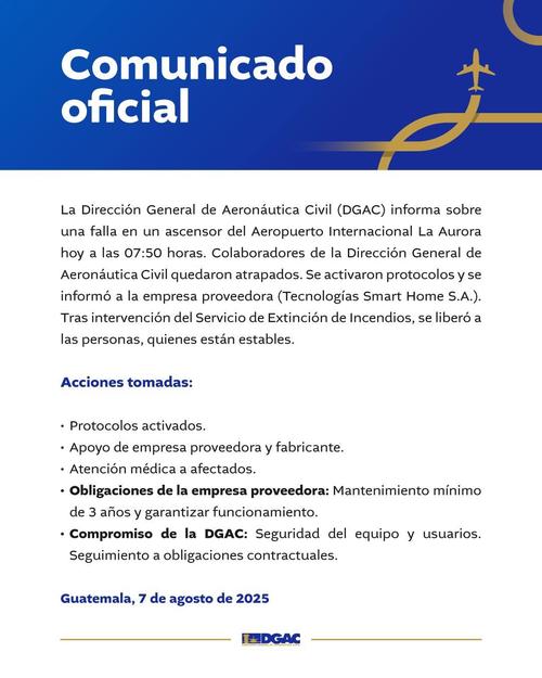 A través de un comunicado, la Dirección General de Aeronáutica Civil (DGAC) informó sobre una falla en uno de los ascensores del Aeropuerto Internacional La Aurora, dejando a 10 de sus colaboradores atrapados.
