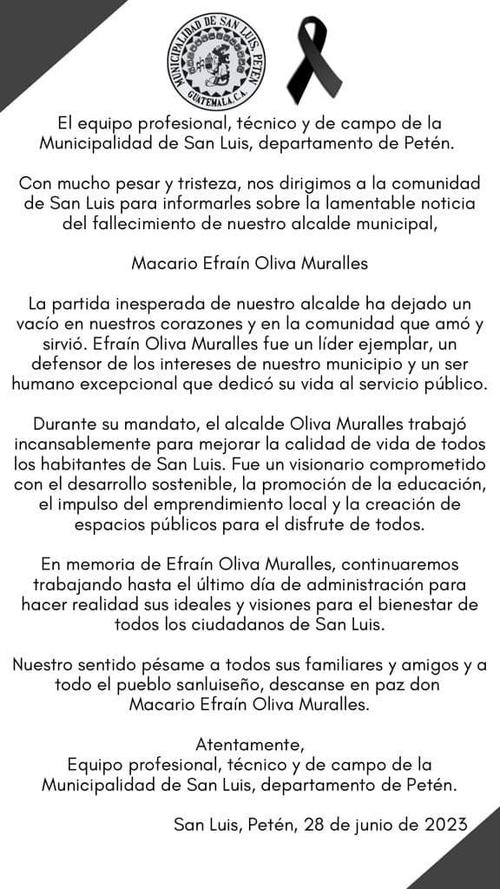 Este miércoles 28 de junio, la Municipalidad de San Luis, del departamento de Petén informó del deceso de Macario Efraín Oliva Muralles, quien era el actual alcalde de dicho municipio.