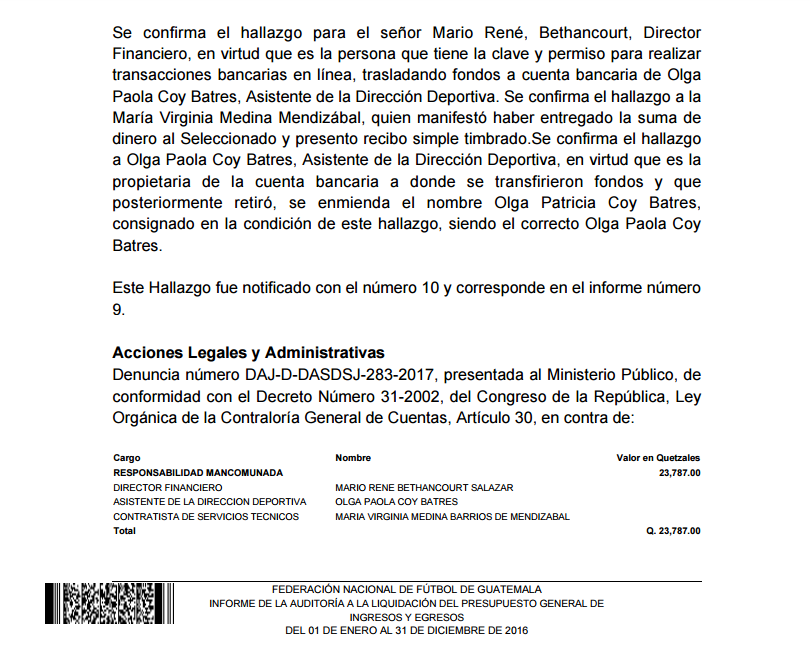 Los auditores detectaron que el 30 de marzo de 2016 se hizo una transferencia desde una de las cuentas bancarias de la Fedefut hacia la de la asistente de la Dirección Deportiva, Olga Paola Coy Batres.