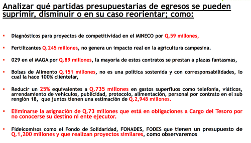 A pesar de contar aún con el dictamen favorable, se conoce que el Presupuesto para 2016 sería de 70 mil 700 millones de quetzales, es decir, 1 mil 700 millones menos que el actual. Se recortaría dinero al programa de Fertilizantes (una propuesta ampliamente apoyada en el Congreso), a la Reforma Policial y al Diario de Centroamérica, entre muchos otros.
