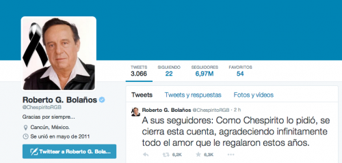 La familia del comediante Roberto Gómez Bolaños "Chespirito", anunció el cierre de la cuenta de Twitter @ChespiritoRGB, que usó hasta pocos días antes de su muerte, ocurrida el 28 de noviembre.