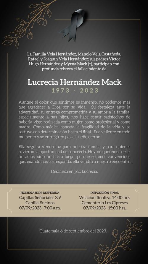 De acuerdo con la información, Hernández Mack recibirá un homenaje de despedida a partir de las 7:00 horas. Este continuará con la disposición final de velación que finalizará a las 14:00 horas, en Capillas Señoriales, zona 9 capitalina.