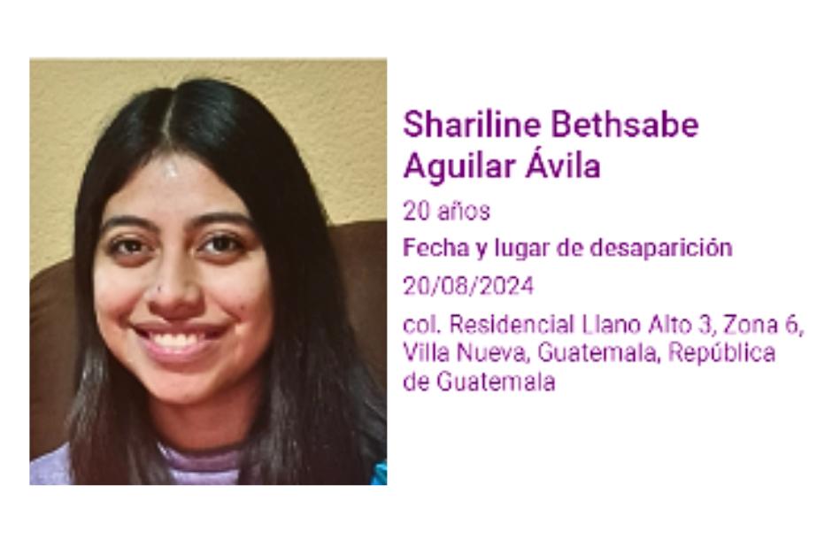 La joven Shariline Bethsabe Aguilar Ávila, de 20 años, se encuentra desaparecida desde el pasado 20 de agosto en la colonia residencial Llano Alto 3, ubicada en la zona 6 de Villa Nueva.