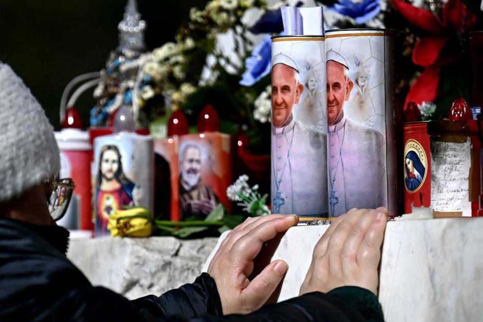 Fieles crean altar con velas y flores para el papa Francisco afuera del hospital Gemelli en Roma.