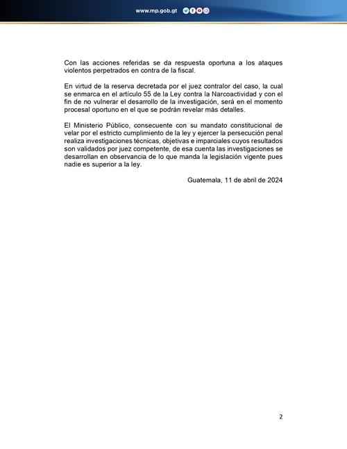 Durante la tarde de este jueves 11 de abril, el MP compartió un comunicado de prensa en el cual explican que la investigación y el caso contra la fiscal Mirian Reguero inició durante el 2022, luego de que ocurriera el primer atentado contra la fiscal.