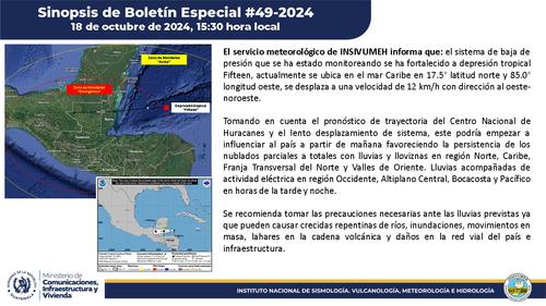 Este viernes 18 de octubre, el Instituto Nacional de Sismología, Vulcanología, Meteorología e Hidrología (Insivumeh) emitió un boletín para informar sobre la formación de la depresión tropical "Fifteen".