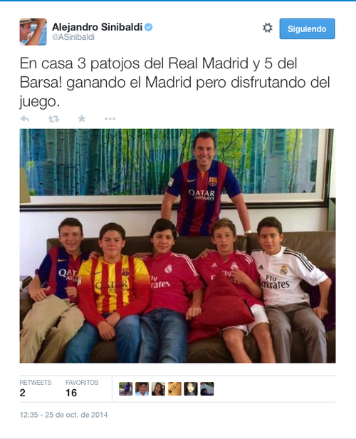 El precandidato del Partido Patriota, Alejandro Sinibaldi, tuvo que sufrir este sábado de clásico español la derrota de su equipo, el Barcelona, y además las críticas en redes sociales que le llovieron por publicar una foto familiar donde el político y sus hijos lucían la camiseta azulgrana en el mítico estadio del equipo catalán, el Camp Nou.