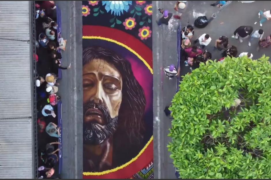 Les tomó más de 7 horas terminar la obra artística que realizaron en la zona 1 capitalina, y frente a cientos de ciudadanos, lograron mostrar un tapete religioso de 45 metros de largo.