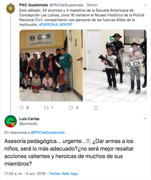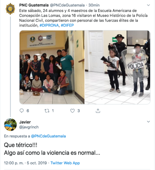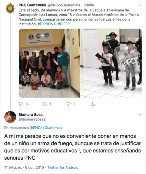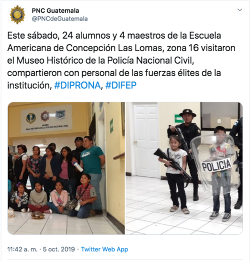 Durante una visita de estudiantes de la Escuela Americana de Concepción Las Lomas, al Museo Histórico de la Policía Nacional Civil, se pudo apreciar el momento en que algunos infantes portan armas largas y escudo de uso de las fuerzas policiales.