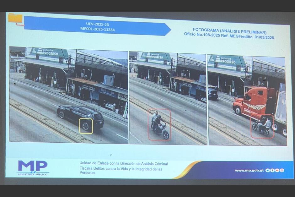 Como parte de la investigación, la fiscalía cuenta con los videos de cámaras de seguridad. En la audiencia presentaron los fotogramas en los que se observa el momento en que el presunto sicario sale de la Colonia El Caracol, en la zona 18, toma la ruta al Atlántico en busca de la víctima, al localizarla, le dan seguimiento y posteriormente le disparan.