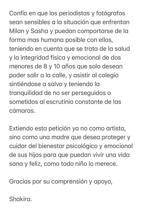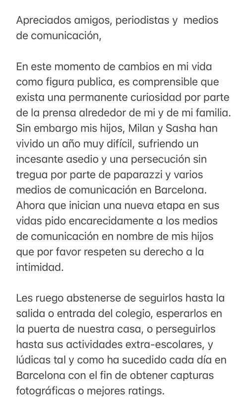 "...Como figura pública es comprensible que exista una permanente curiosidad por parte de la prensa alrededor de mi y de mi familia..", escribió, afirmando que ha sido un año muy difícil para sus hijos por la constante persecución que vivieron en Barcelona.