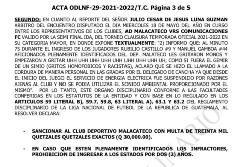 Debido a este hecho reportado, el Órgano Disciplinario sancionó al club Malacateco con una multa de 30 mil quetzales.