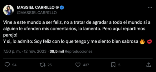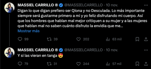 En su cuenta oficial de "X", Carrillo respondió a los comentarios con una polémica respuesta: "Digan lo que digan prefiero ser Qlona y no desculada. Lo más importante siempre será gustarme primero a mi y yo feliz disfrutando mi cuerpo. Así que los hombres que hablan mal mejor critiquen a su mujer y a las mujeres que hablen mal no saben cuánto disfruto la envidia que me tienen. Besos", escribió adjuntando un emoji que lanzaba un beso. Remataría esta publicación diciendo "Y si las vieran en tanga", colocando un emoji de ojos de corazón.