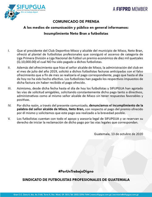 “Además del ofrecimiento que hizo el señor alcalde de Mixco, la administración del club en el mes de julio de 2019 solicitó a dichos futbolistas facturas anticipadas con el falso ofrecimiento que a fin de mes se realizaría el pago correspondiente, pago que hasta la fecha no se ha hecho efectivo. Los futbolistas han pagado los impuestos de la factura sin haber recibido el pago ofrecido”, indica el comunicado emitido por el SIFUPGUA.