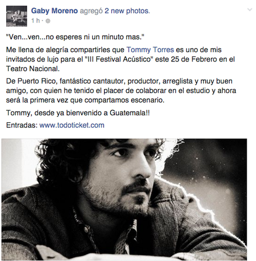 Gaby Moreno publicó en redes sociales al primer invitado, que participará en el III Festival Acústico, que se celebrará en el Centro Cultural Miguel Ángel Asturias, el 25 de febrero a las 7 de la noche.