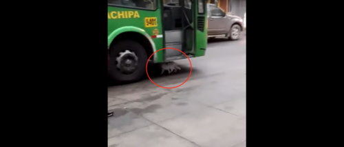 Sin embargo, un bus pasa y no se percata del animal. De inmediato comienzan los gritos de las personas para advertir al piloto, pero el felino en lugar de retirarse, busca refugio en las llantas delanteras del bus.