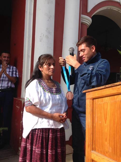 "Cuando tenía 8 años, mi mamá con 35 quetzales me compró una caja para lustrar zapatos, porque mi papá nos abandonó y no teníamos para comer", dijo Barrondo, quien rompió el protocolo y le colgó la medalla a su mamá en pleno acto.